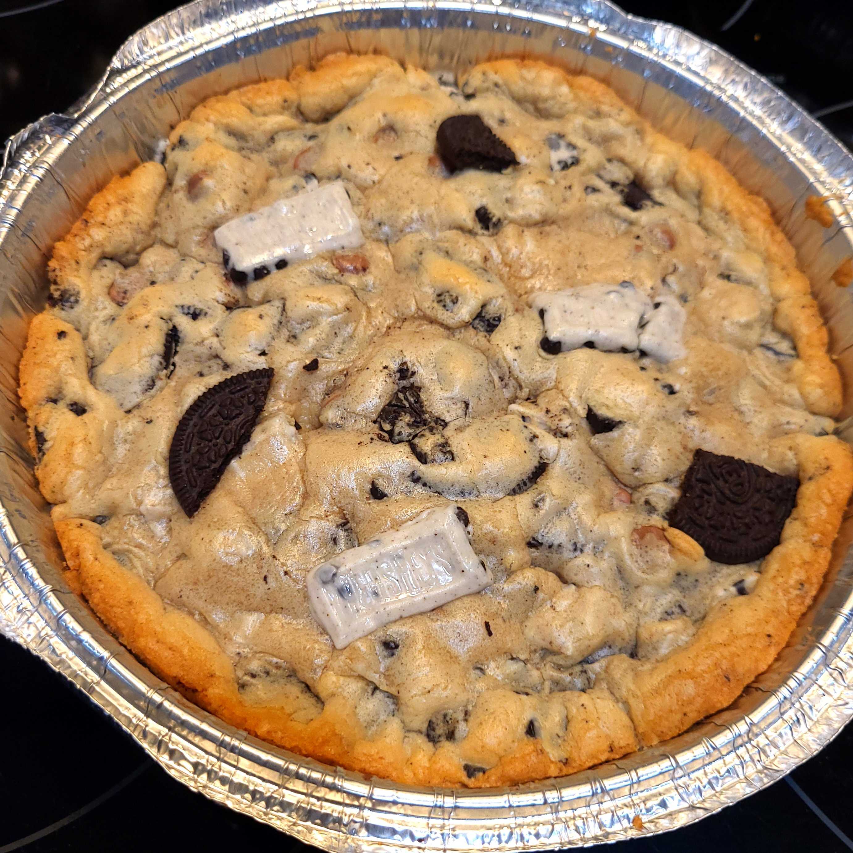 Ingredients: Enriched all-purpose flour (wheat flour), Oreo cookies, Hershey’s Cookies ‘n’ Creme bar, unsalted butter (cream), granulated sugar, brown sugar, egg, milk chocolate chips, baking soda, pure vanilla extract.